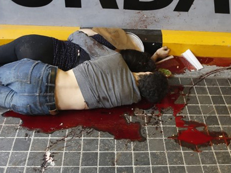 一瞬にして現場は阿鼻叫喚にまみれ、死者がフロアに倒れて床を血まみれにした。