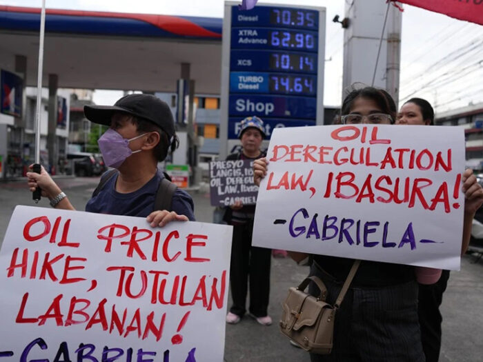パシグやケソンといった主要都市の給油所では、すでに不穏な光景が広がっている。活動家たちが掲示板に黒い泥を投げつけ、高騰する燃料価格への不満を表明している。